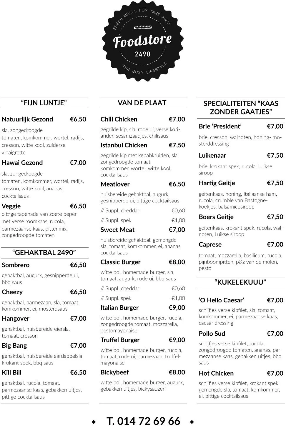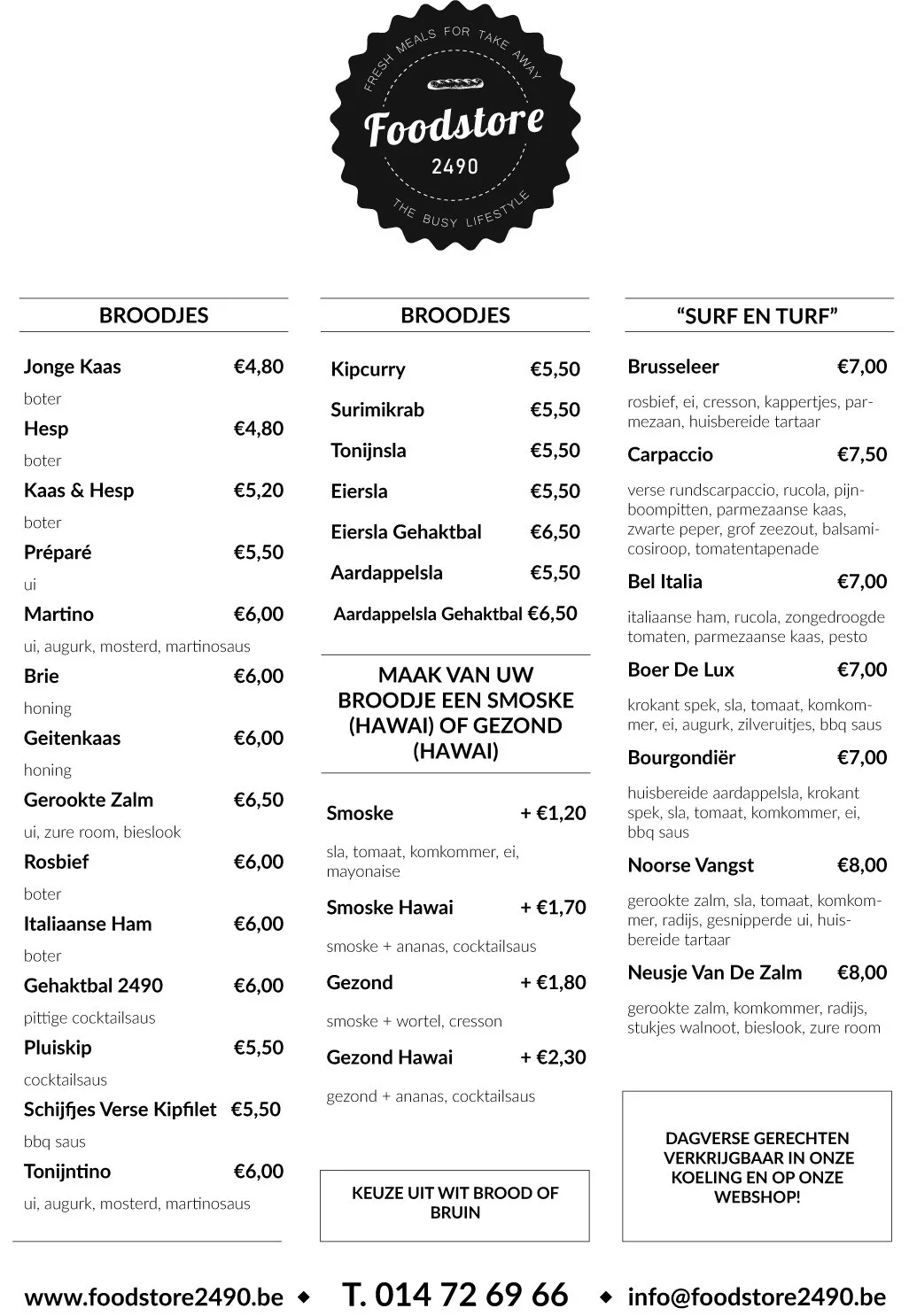 Klik hier om de menu te downloaden.Broodjes enkel afhaal in de winkel of levering voor bedrijven.Nieuw bedrijf? Contacteer ons voor meer info op 014 72 69 66 AdresGasthuisstraat 12490 BalenOpenen in Maps OpeningsurenMaandag: 8:30u - 18:00uDinsdag: 8:30u - 18:00uWoensdag: GeslotenDonderdag: 8:30u - 14:0016:00 - 18:00Vrijdag: 8:00u - 14:00uZaterdag: GeslotenZondag: 11:00 - 19:00 Contactinfo@foodstore2490.be+32 (0)14 72 69 66 Fresh convenient take out for any lifestyle © 2025 Foodstore2490